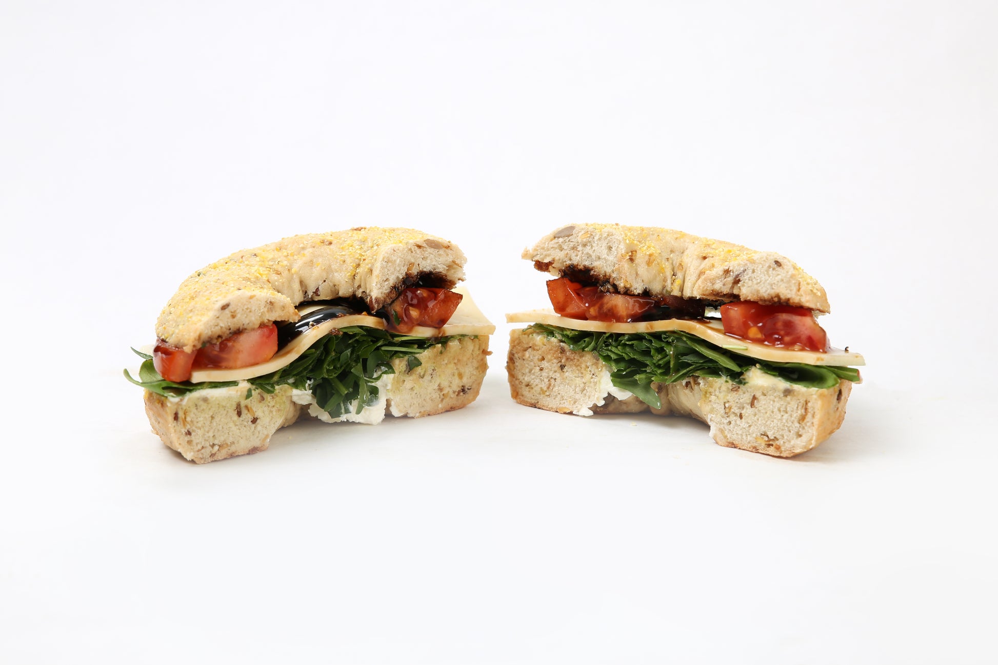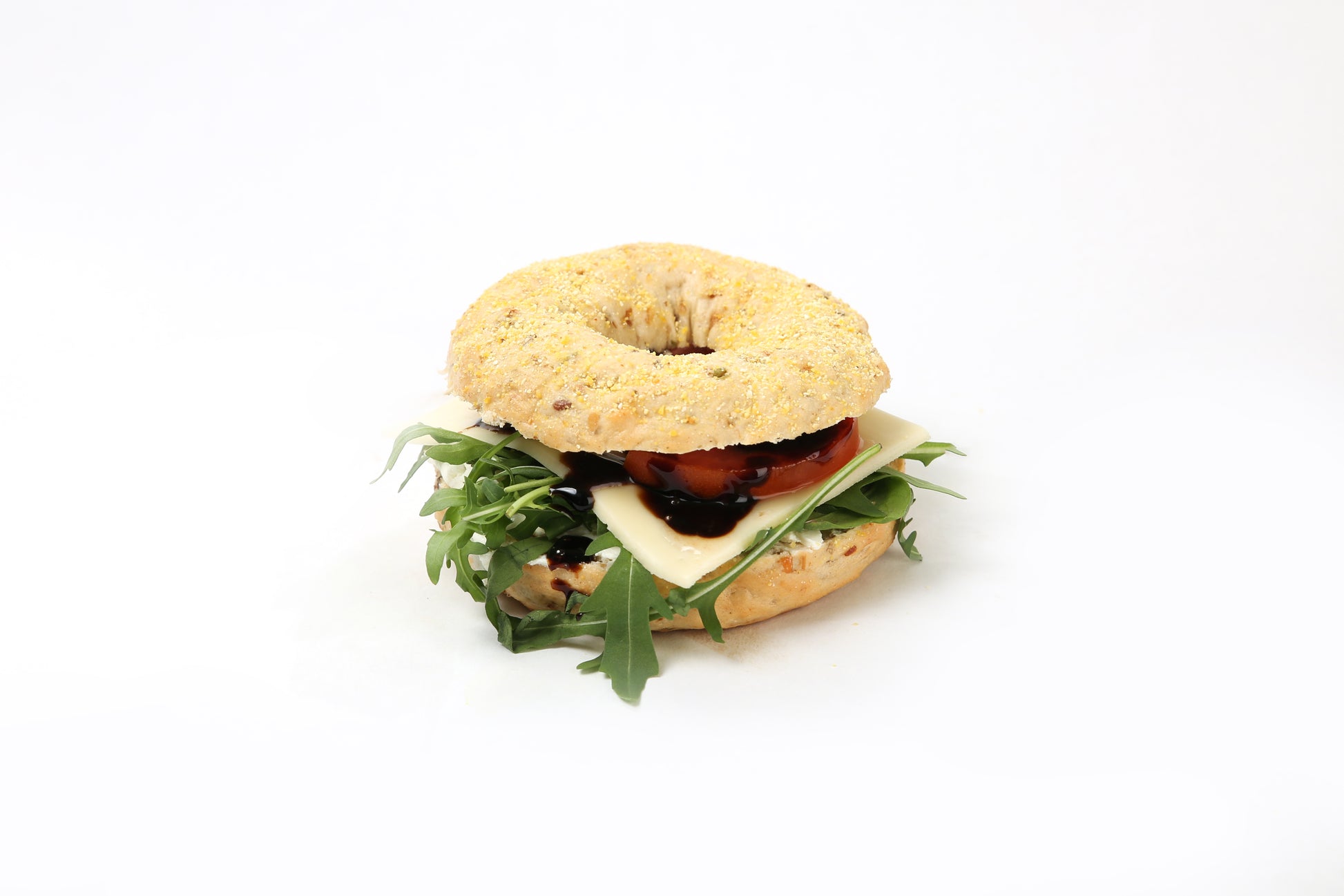mit veganem Frischkäse und veganem "Gouda"- Käse, Salat, Gurke,Tomate und Balsamico-Creme,